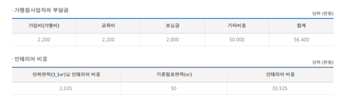 가맹비, 교육비,보등금, 기타비용을 합쳐서 가맹사업자 부담금은 총 6000만원 정도 나온다. 그리고 인테리어 비용은 약 15평을 기준으로 3100만원 정도 나온다